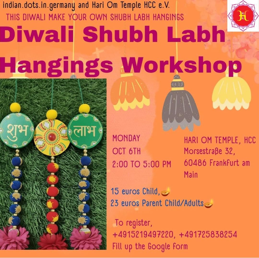 Make your own traditional Shubh Labh hangings for this festive season.πŸ“… Date: October 6th (Monday)πŸ•‘ Time: 2:00 PM – 5:00 PMπŸ“ Venue: Hari Om Temple, Morsestraße 32, 60486 Frankfurt am…